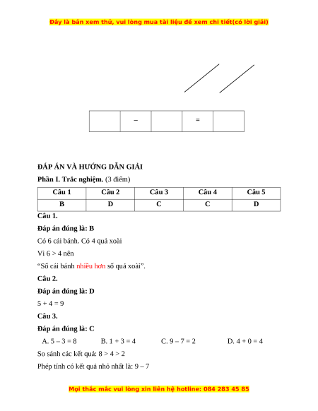 “Số cái bánh nhiều hơn số quả xoài”. Câu 2. Đáp án đúng là: D 5 + 4 = 9 Câu 3. Đáp án đúng là: C A. 5 – 3 = 8 B. 1 + 3 = 4 C. 9 – 7 = 2 D. 4 + 0 = 4