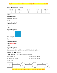 Phần I. Trắc nghiệm. (3 điểm) Câu 1 Câu 2 Câu 3 Câu 4 Câu 5 C A B C D Câu 1: Đáp án đúng là: C Số bé hơn 7 là: 3, 6, 4 Câu 2. Đáp án đúng là: A 3 – 0 = 3 Câu 3. Đáp án đúng là: B Hình vuông là: Câu 4. Đáp án đúng là: C