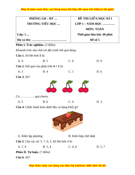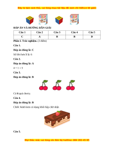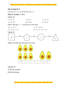 Số lớn hơn 5 là: 6 Câu 2. Đáp án đúng là: A 4 + 1 = 5 Câu 3. Đáp án đúng là: B Có 6 quả cherry. Câu 4. Đáp án đúng là: B