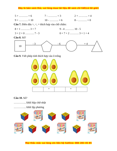 Câu 7. Điền dấu >, <, = thích hợp vào chỗ chấm: 8 + 1 ………. 3 + 7 9 - 4 ………. 10 - 5 3 + 2 + 0 ………. 7 - 3 0 + 7 + 2 ………. 3 + 1 + 4 Câu 8. Số? - 3 - 6 + 4 10