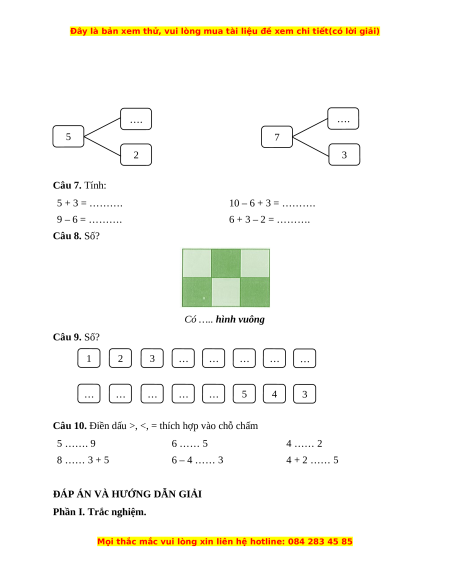 …. …. 5 7 2 3 Câu 7. Tính: 5 + 3 = ………. 10 – 6 + 3 = ………. 9 – 6 = ………. 6 + 3 – 2 = ………. Câu 8. Số?