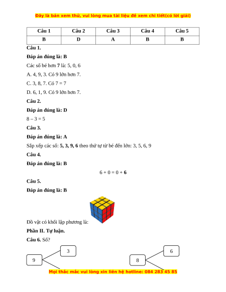 Câu 1. Các số bé hơn 7 là: A. 4, 9, 3 B. 5, 0, 6 C. 3, 8, 7 D. 6, 1, 9