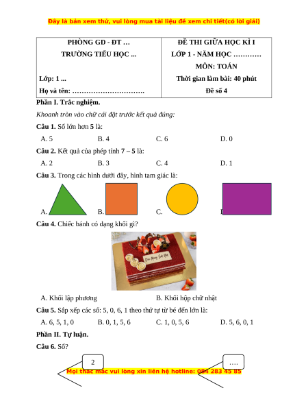 Số lớn hơn 5 là: 6 Câu 2. Đáp án đúng là: A 7 – 5 = 2 Câu 3. Đáp án đúng là: A Hình tam giác là: Câu 4. Đáp án đúng là: B