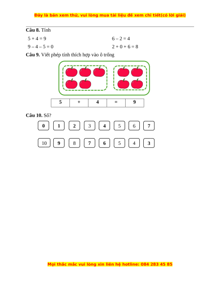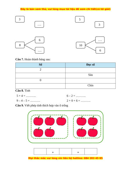 Câu 7. Hoàn thành bảng sau: Số Đọc số 2 Sáu 0 Chín Câu 8. Tính 5 + 4 = ………. 6 – 2 = ………. 9 – 4 – 5 = ………. 2 + 0 + 6 = ……….