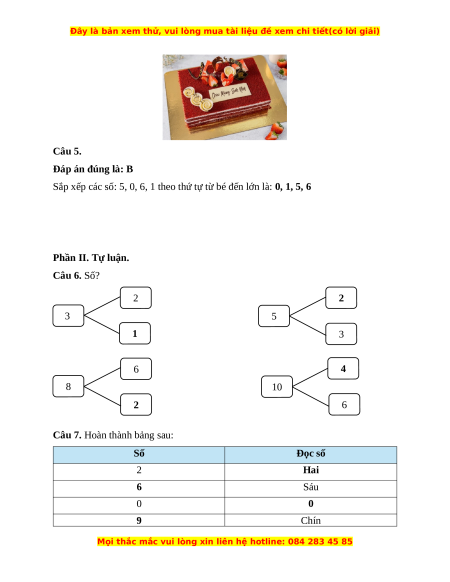 Câu 5. Sắp xếp các số: 5, 0, 6, 1 theo thứ tự từ bé đến lớn là: A. 6, 5, 1, 0 B. 0, 1, 5, 6 C. 1, 0, 5, 6 D. 5, 6, 0, 1