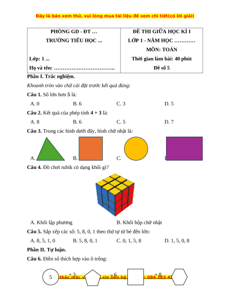Số lớn hơn 5 là: 6 Câu 2. Đáp án đúng là: D 4 + 3 = 7 Câu 3. Đáp án đúng là: D Hình chữ nhật là: Câu 4. Đáp án đúng là: A