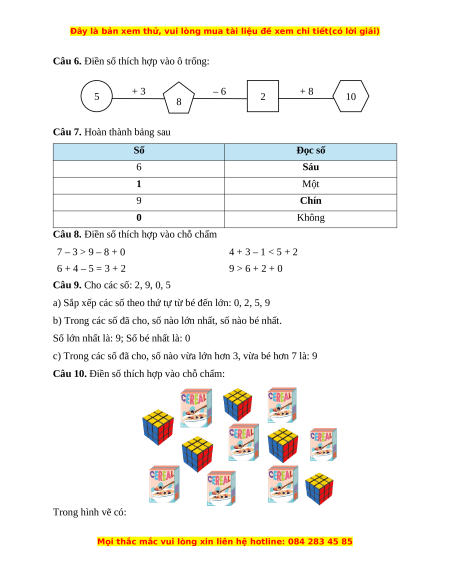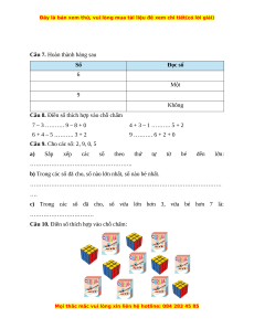 Câu 8. Điền số thích hợp vào chỗ chấm 7 – 3 ………. 9 – 8 + 0 4 + 3 – 1 ………. 5 + 2 6 + 4 – 5 ………. 3 + 2 9 ………. 6 + 2 + 0