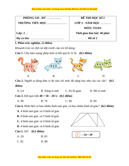 Câu 5. Số? (0,5 điểm) ? ? – 54 = 29 – A. 20 B. 83 C. 82 D. 88