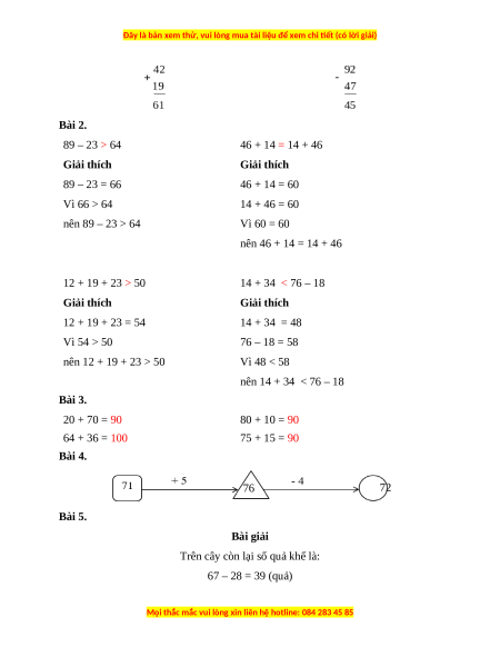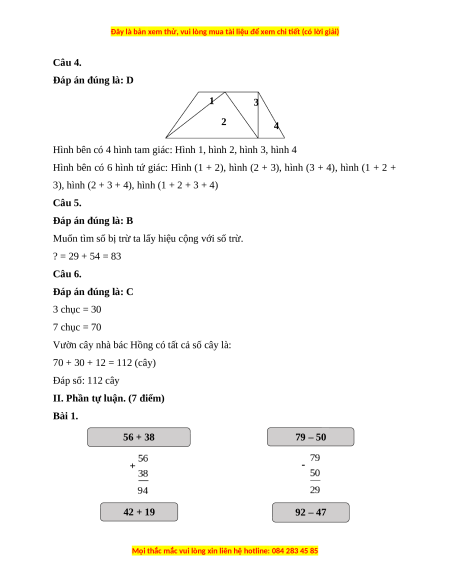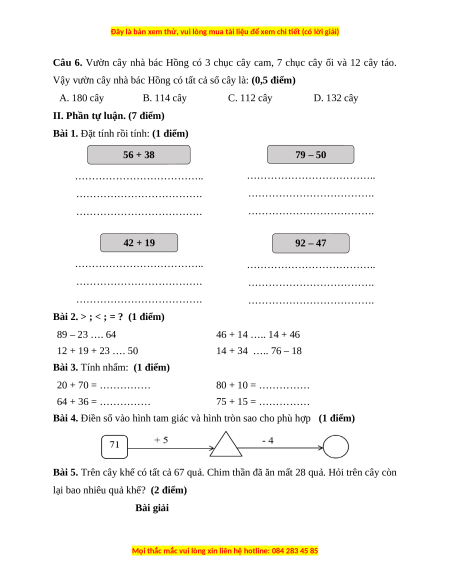 II. Phần tự luận. (7 điểm) Bài 1. 56 + 38 79 – 50 42 + 19 92 – 47