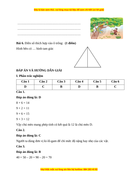 I. Phần trắc nghiệm Câu 1 Câu 2 Câu 3 Câu 4 Câu 5 Câu 6 D C B D B C Câu 1. Đáp án đúng là: D 8 + 6 = 14 9 + 2 = 11 9 + 6 = 15 9 + 3 = 12