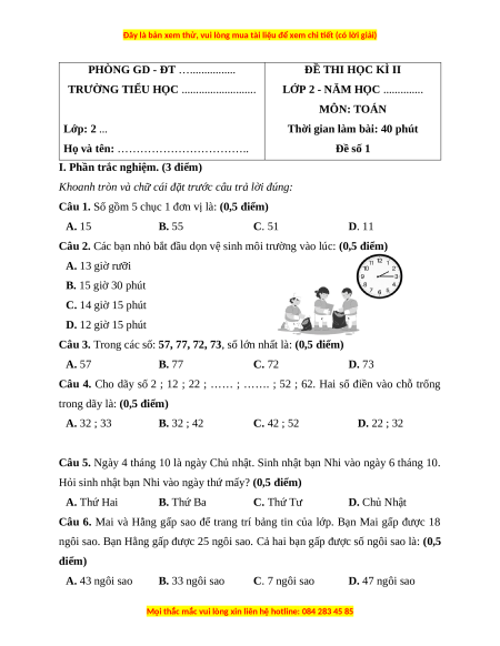 Câu 2. Các bạn nhỏ bắt đầu dọn vệ sinh môi trường vào lúc: (0,5 điểm) A. 13 giờ rưỡi B. 15 giờ 30 phút C. 14 giờ 15 phút D. 12 giờ 15 phút