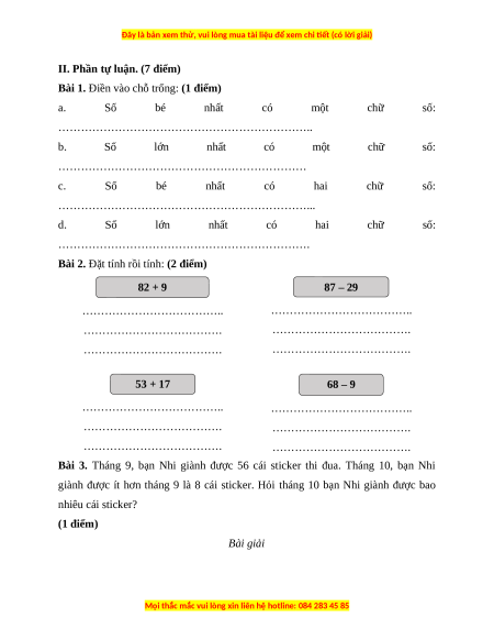 Bài 2. Đặt tính rồi tính: (2 điểm) 82 + 9 87 – 29