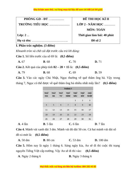 Câu 2. Kết quả của phép tính 82 – 28 + 15 là: (0,5 điểm) A. 79 B. 68 C. 69 D. 59
