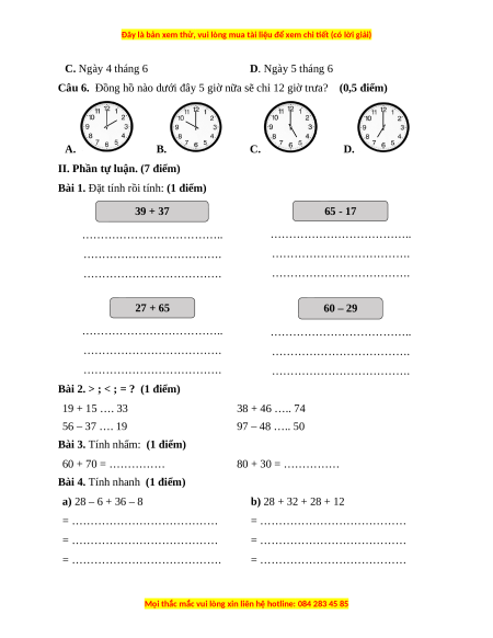 Câu 6. Đồng hồ nào dưới đây 5 giờ nữa sẽ chỉ 12 giờ trưa? (0,5 điểm) A. B. C. D.