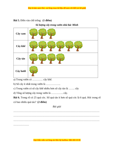 d) Tổng số lượng cây trong vườn là ………….. cây.