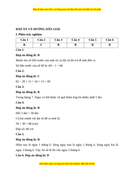 Số liền trước của số 69 là: 69 – 1 = 68 Câu 2. Đáp án đúng là: C 82 – 28 + 15 = 54 + 15 = 69 Câu 3. Đáp án đúng là: B