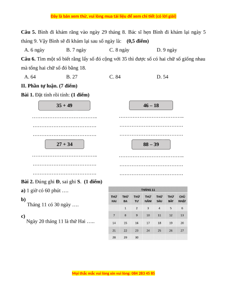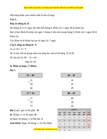 Câu 5. Bình đi khám răng vào ngày 29 tháng 8. Bác sĩ hẹn Bình đi khám lại ngày 5