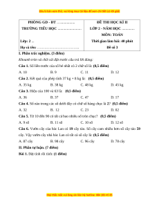 Câu 2. Kết quả của phép tính 37 kg + 8 kg là: (0,5 điểm) A. 35 kg B. 38 kg C. 48 kg D. 45 kg
