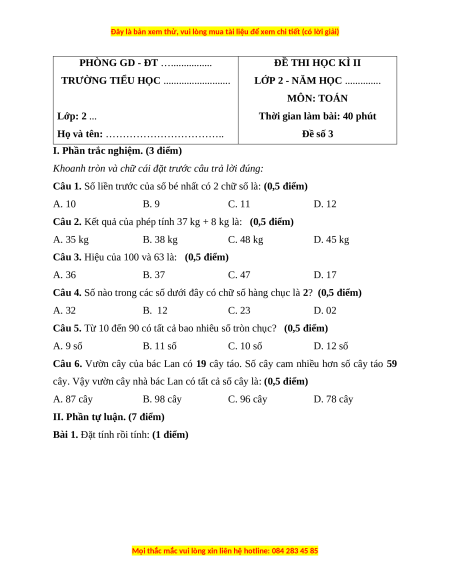 cây. Vậy vườn cây nhà bác Lan có tất cả số cây là: (0,5 điểm) A. 87 cây B. 98 cây C. 96 cây D. 78 cây