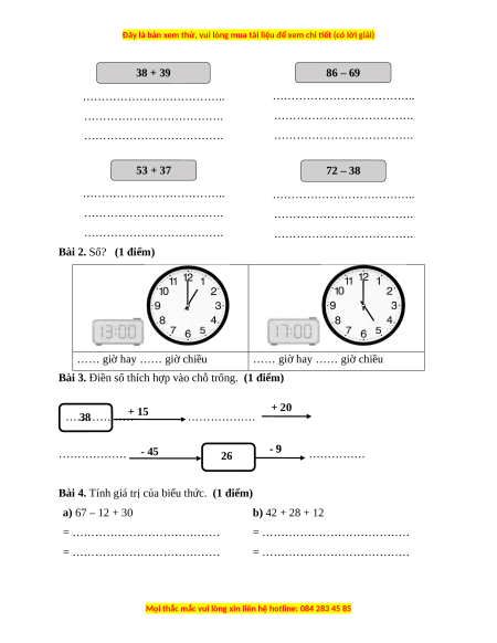 II. Phần tự luận. (7 điểm) Bài 1. 38 + 39 86 – 69