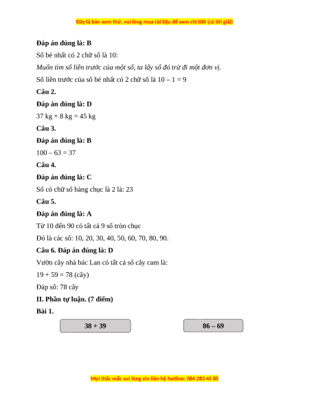 Số liền trước của số bé nhất có 2 chữ số là 10 – 1 = 9 Câu 2. Đáp án đúng là: D 37 kg + 8 kg = 45 kg Câu 3. Đáp án đúng là: B 100 – 63 = 37 Câu 4. Đáp án đúng là: C