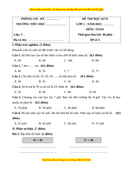 Họ và tên: …………………………….. Đề số 5