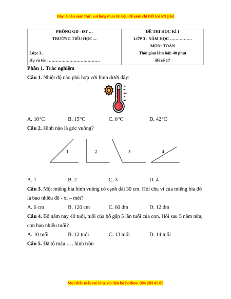Đề thi cuối kì 1 Toán lớp 3 Cánh diều - Đề 17