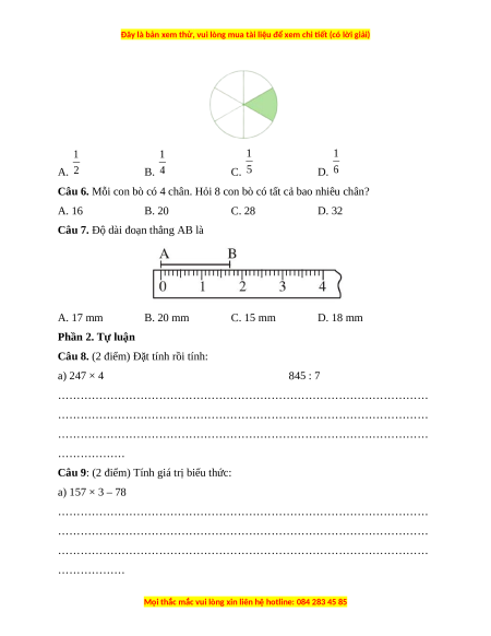 Câu 6. Mỗi con bò có 4 chân. Hỏi 8 con bò có tất cả bao nhiêu chân? A. 16 B. 20 C. 28 D. 32