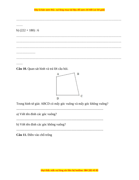 Câu 8. (2 điểm) Đặt tính rồi tính: a) 247 × 4 845 : 7