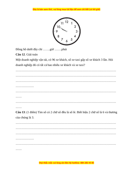 Đồng hồ dưới đây chỉ …….giờ …….phút Câu 12. Giải toán