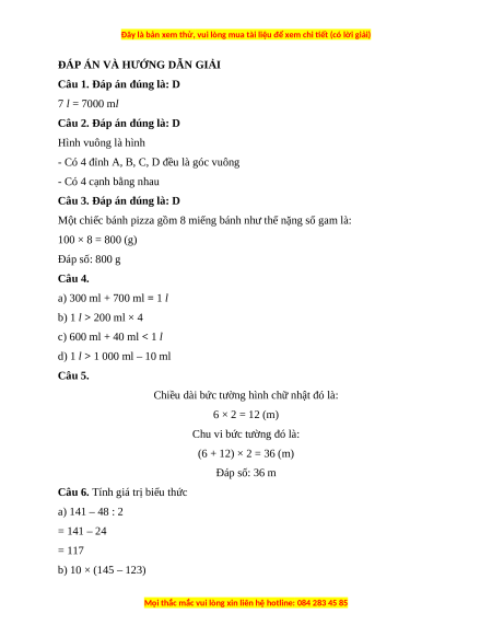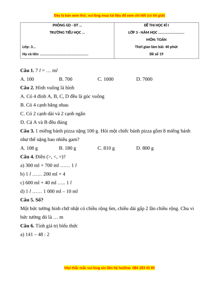 Câu 1. 7 l = … ml A. 100 B. 700 C. 1000 D. 7000