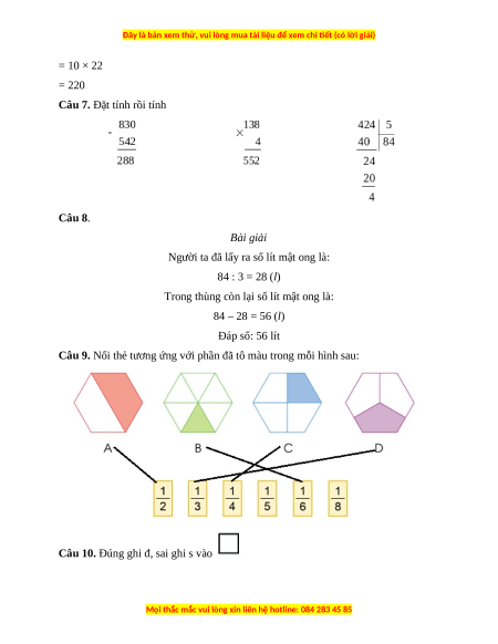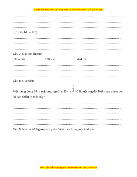 Câu 7. Đặt tính rồi tính 830 – 542 138 × 4 424 : 5