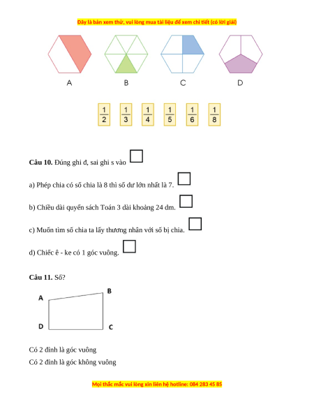 Câu 10. Đúng ghi đ, sai ghi s vào