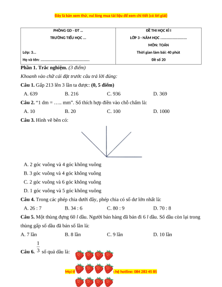 Câu 1. Gấp 213 lên 3 lần ta được: (0, 5 điểm) A. 639 B. 216 C. 936 D. 369