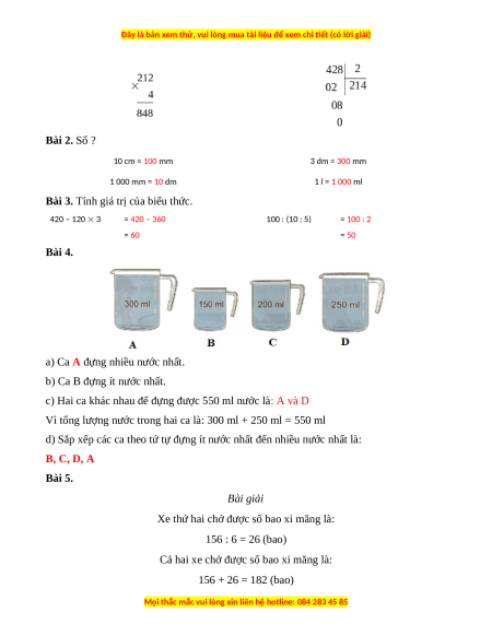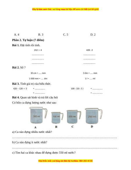 Bài 1. Đặt tính rồi tính. 212 4 428 : 2 …………………. …………………. …………………. …………………. …………………. …………………. Bài 2. Số ? 10 cm = ….. mm 3 dm = ….. mm 1 000 mm = ….. dm 1 l = ….. ml