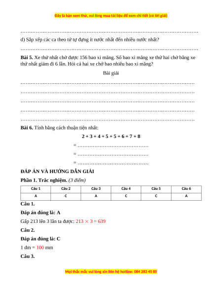 Gấp 213 lên 3 lần ta được: 213 3 = 639 Câu 2. Đáp án đúng là: C 1 dm = 100 mm Câu 3.