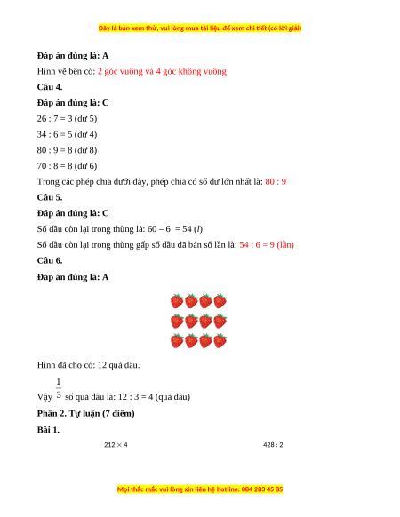Hình vẽ bên có: 2 góc vuông và 4 góc không vuông Câu 4. Đáp án đúng là: C 26 : 7 = 3 (dư 5) 34 : 6 = 5 (dư 4) 80 : 9 = 8 (dư 8) 70 : 8 = 8 (dư 6)