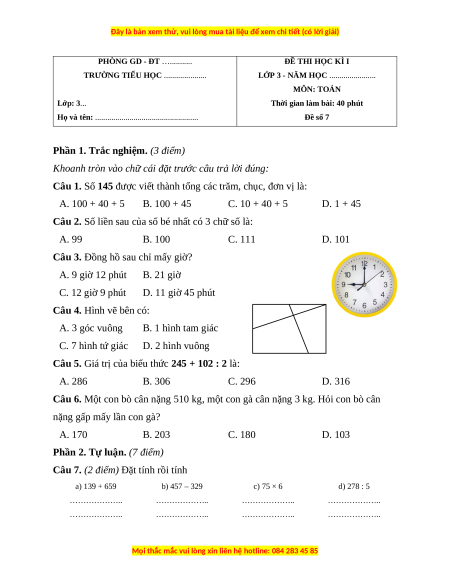 LỚP 3 - NĂM HỌC ....................... MÔN: TOÁN Lớp: 3...