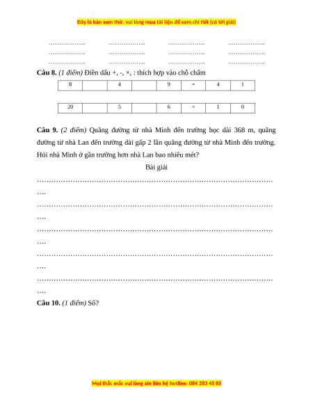 Câu 9. (2 điểm) Quãng đường từ nhà Minh đến trường học dài 368 m, quãng