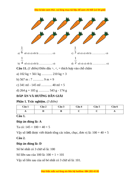 Phần 1. Trắc nghiệm. (3 điểm) Câu 1 Câu 2 Câu 3 Câu 4 Câu 5 Câu 6 A D B C C A Câu 1. Đáp án đúng là: A Ta có: 145 = 100 + 40 + 5