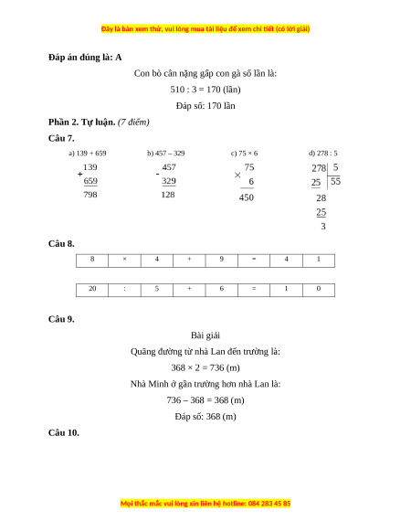 Câu 7. (2 điểm) Đặt tính rồi tính a) 139 + 659 b) 457 – 329 c) 75 × 6 d) 278 : 5 ……………….. ……………….. ……………….. ……………….. ……………….. ……………….. ……………….. ………………..