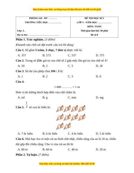 số con ốc biển là: 10 : 2 = 5 (ốc biển) Câu 6. Đáp án đúng là: B Chiều dài cái ao là: 10 × 2 = 20 (m) Chu vi cái ao là: