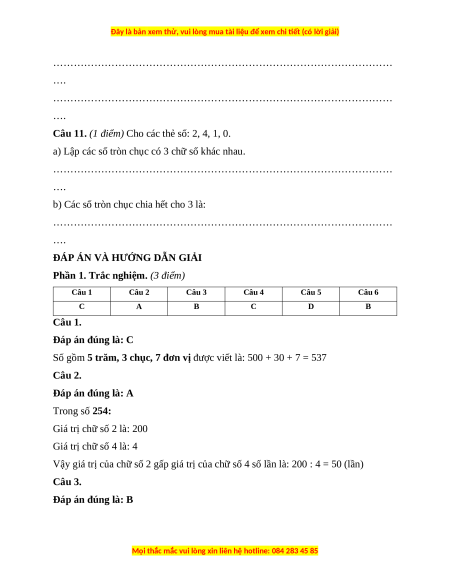 Số gồm 5 trăm, 3 chục, 7 đơn vị được viết là: 500 + 30 + 7 = 537 Câu 2. Đáp án đúng là: A Trong số 254: