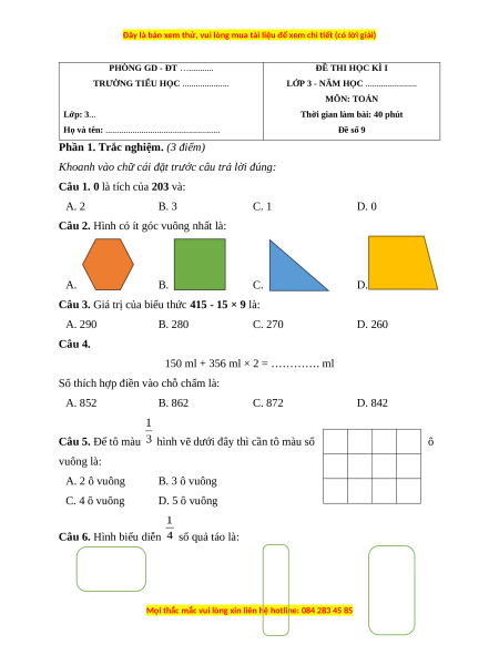 Câu 3. Giá trị của biểu thức 415 - 15 × 9 là: A. 290 B. 280 C. 270 D. 260 Câu 4.