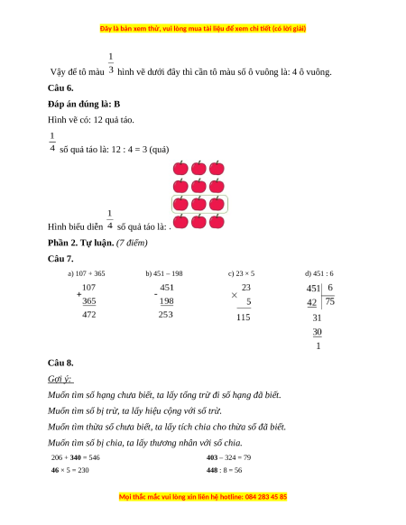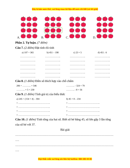 Câu 7. (2 điểm) Đặt tính rồi tính a) 107 + 365 b) 451 – 198 c) 23 × 5 d) 451 : 6 ……………….. ……………….. ……………….. ……………….. ……………….. ……………….. ……………….. ……………….. ……………….. ……………….. ……………….. ……………….. ……………….. ……………….. ……………….. ……………….. ……………….. ……………….. ……………….. ……………….. ……………….. ……………….. ……………….. ………………..