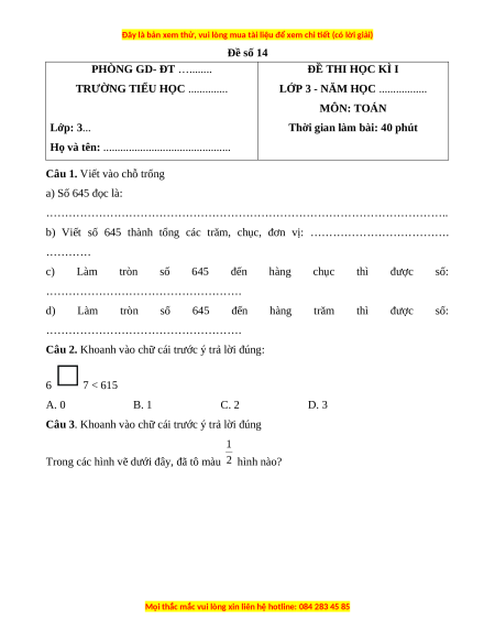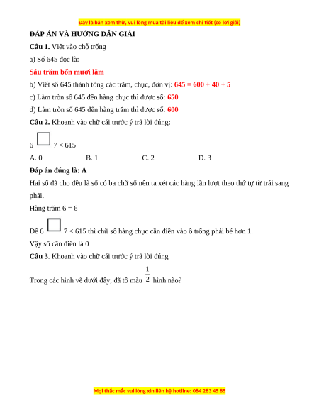 Câu 1. Viết vào chỗ trống a) Số 645 đọc là: