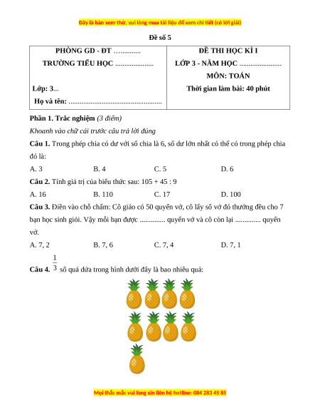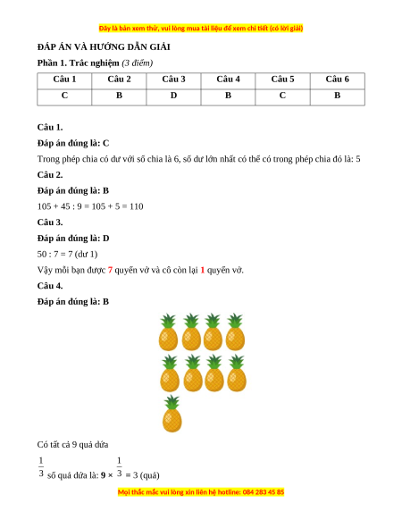 Vậy mỗi bạn được 7 quyển vở và cô còn lại 1 quyển vở. Câu 4. Đáp án đúng là: B Có tất cả 9 quả dứa