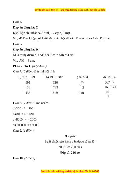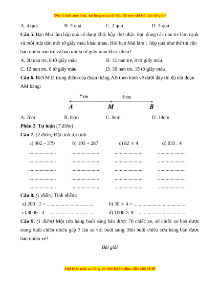 Câu 7. (2 điểm) Đặt tính rồi tính a) 902 – 379 b) 193 + 287 c) 82 4 d) 833 : 4 ...................... ...................... ...................... ...................... ...................... ...................... ...................... ...................... ...................... ...................... ...................... ...................... ...................... ...................... ...................... ...................... ...................... ...................... ...................... ......................