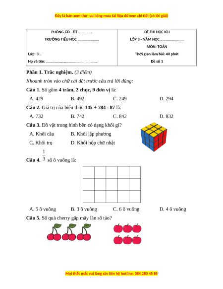 LỚP 3 - NĂM HỌC ....................... MÔN: TOÁN Lớp: 3...