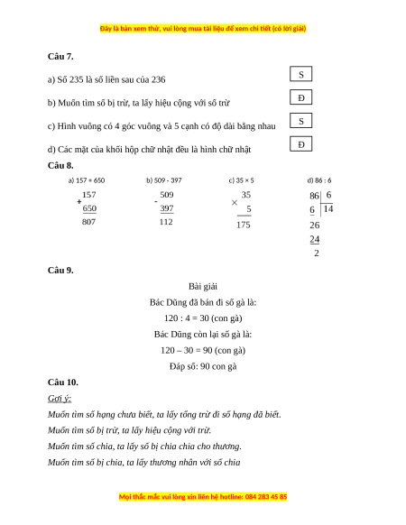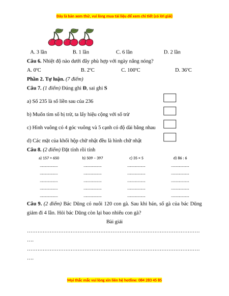 Câu 8. (2 điểm) Đặt tính rồi tính a) 157 + 650 b) 509 – 397 c) 35 × 5 d) 86 : 6 ………………. ………………. ………………. ………………. ………………. ………………. ………………. ………………. ………………. ………………. ………………. ………………. ………………. ………………. ………………. ………………. ………………. ………………. ………………. ……………….